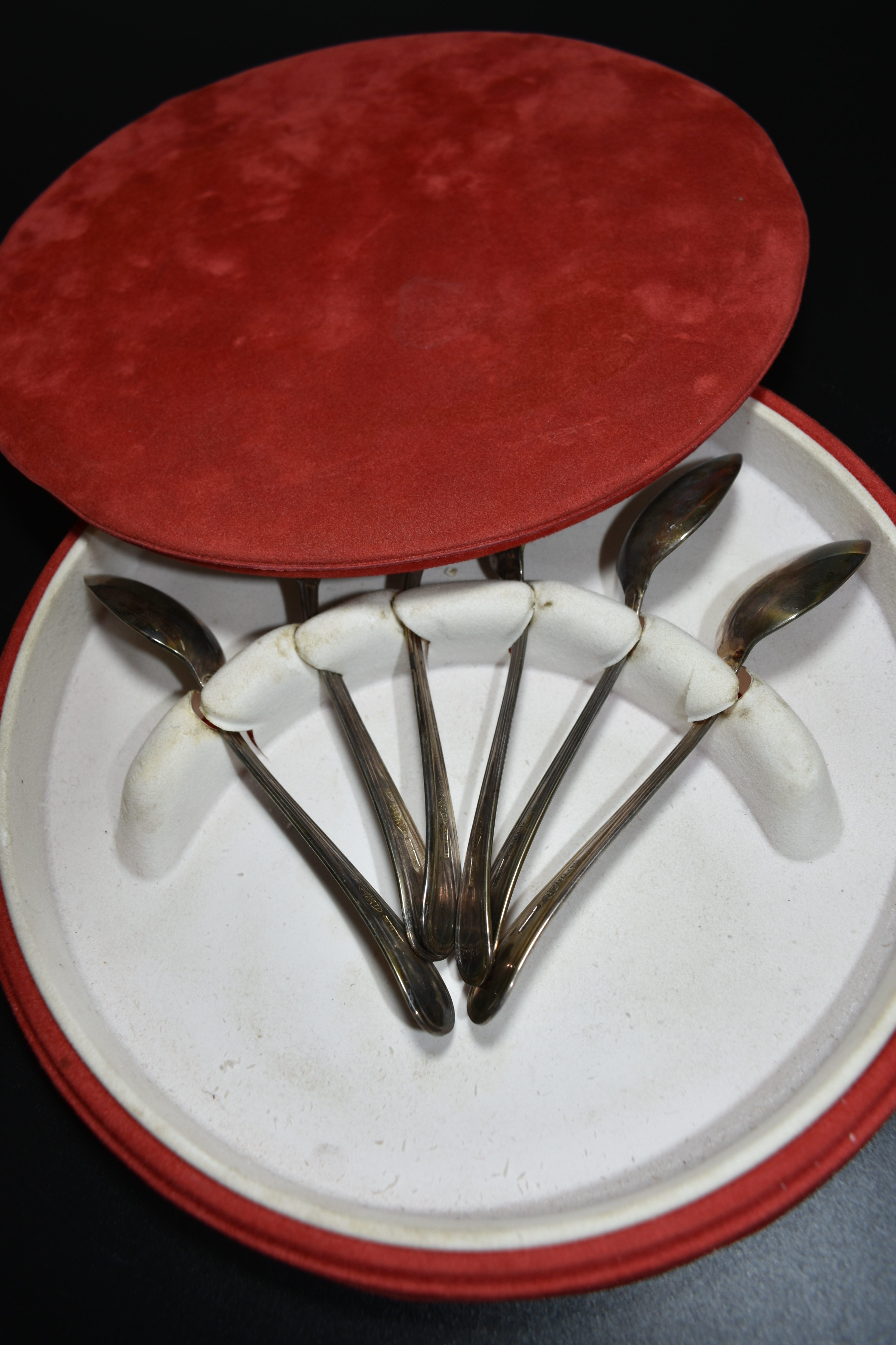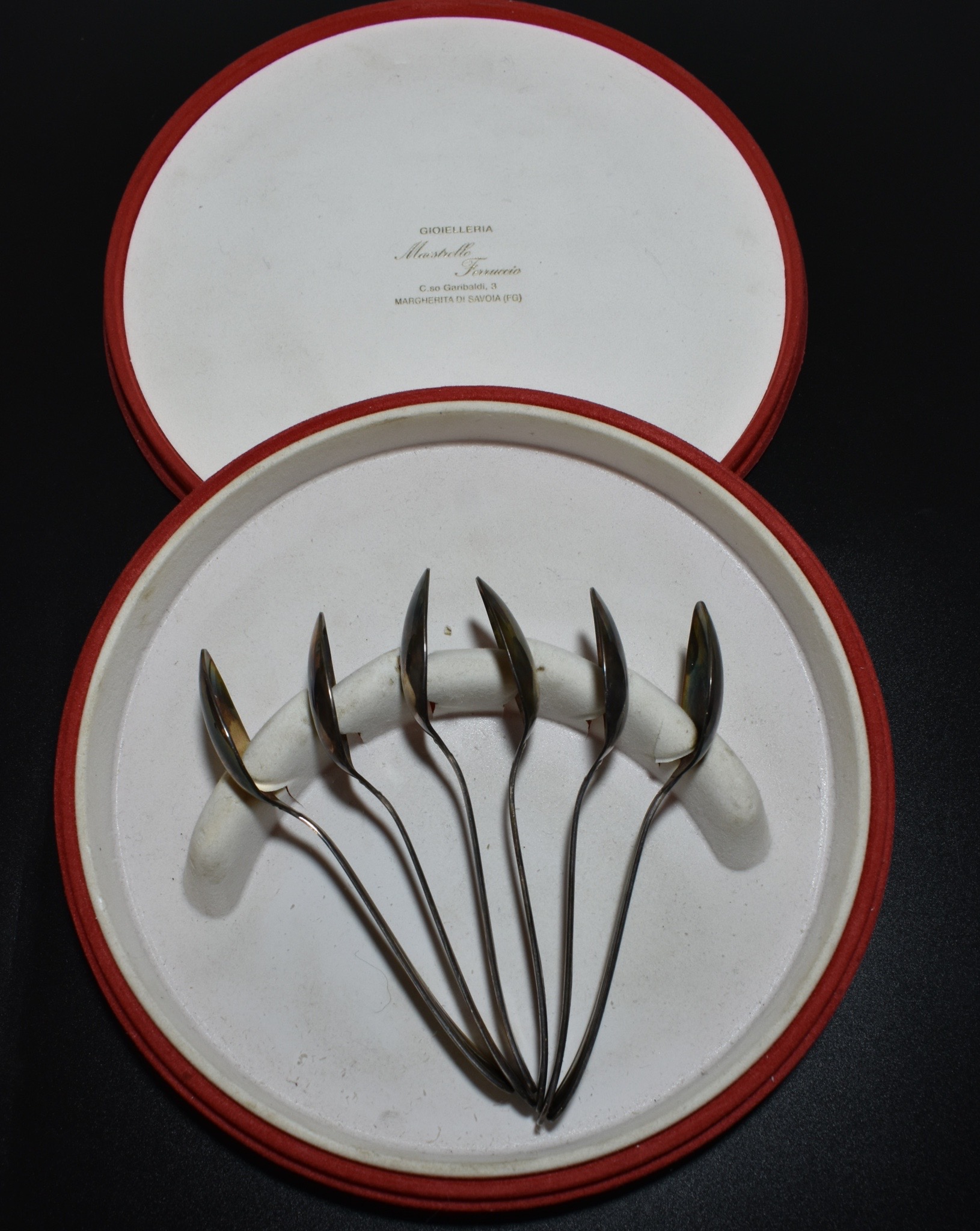 6 anciennes petites cuillères Bugatti 1923 en argent 800 millièmes, dans leur boite d’origine.