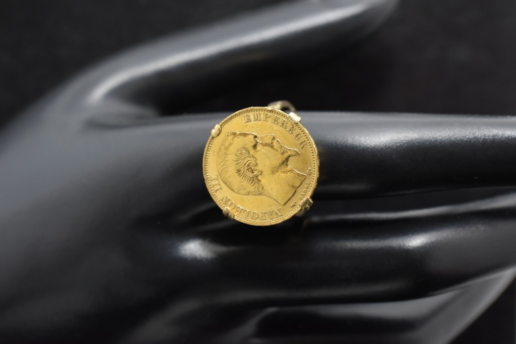 Bague d’occasion montée d’une 20F Napoléon ORTIZ DENIS il y a 5 ans Bague montée d’un 20F Napoléon 1859 6,45g 22ct et 5,65 de 18ct.