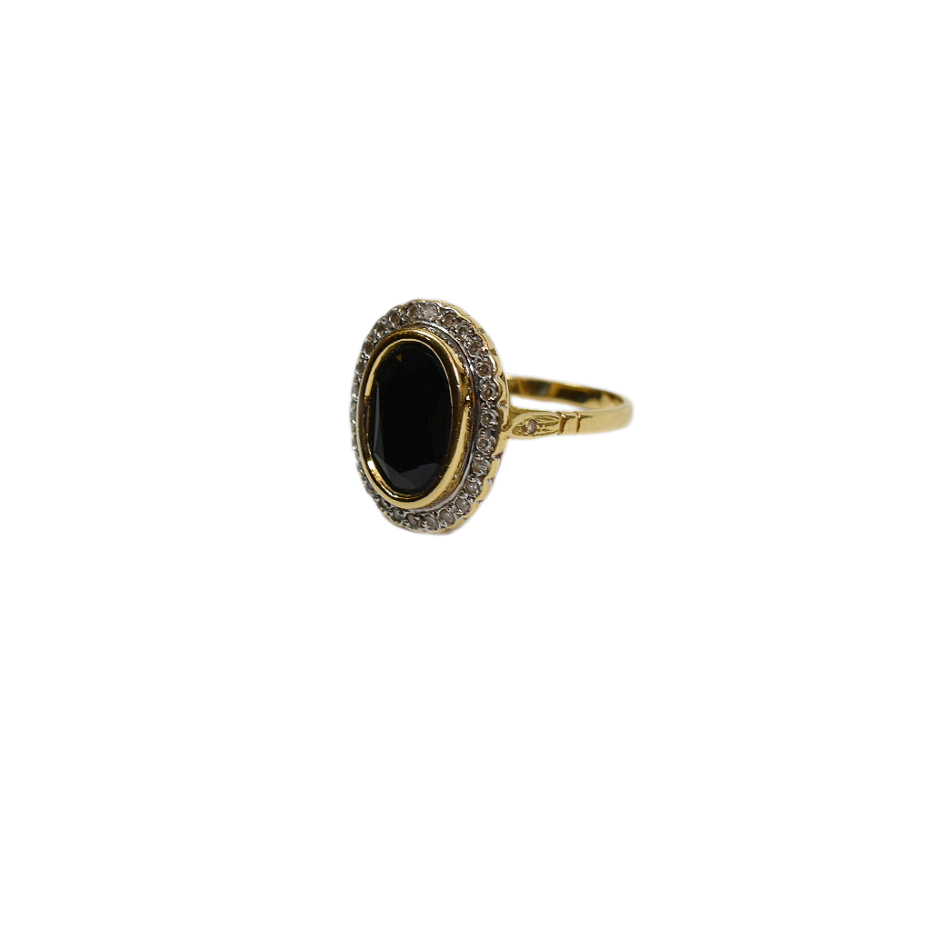 Bague en or jaune et soulignée d’or blanc ornée d’un saphir et sertie de diamants