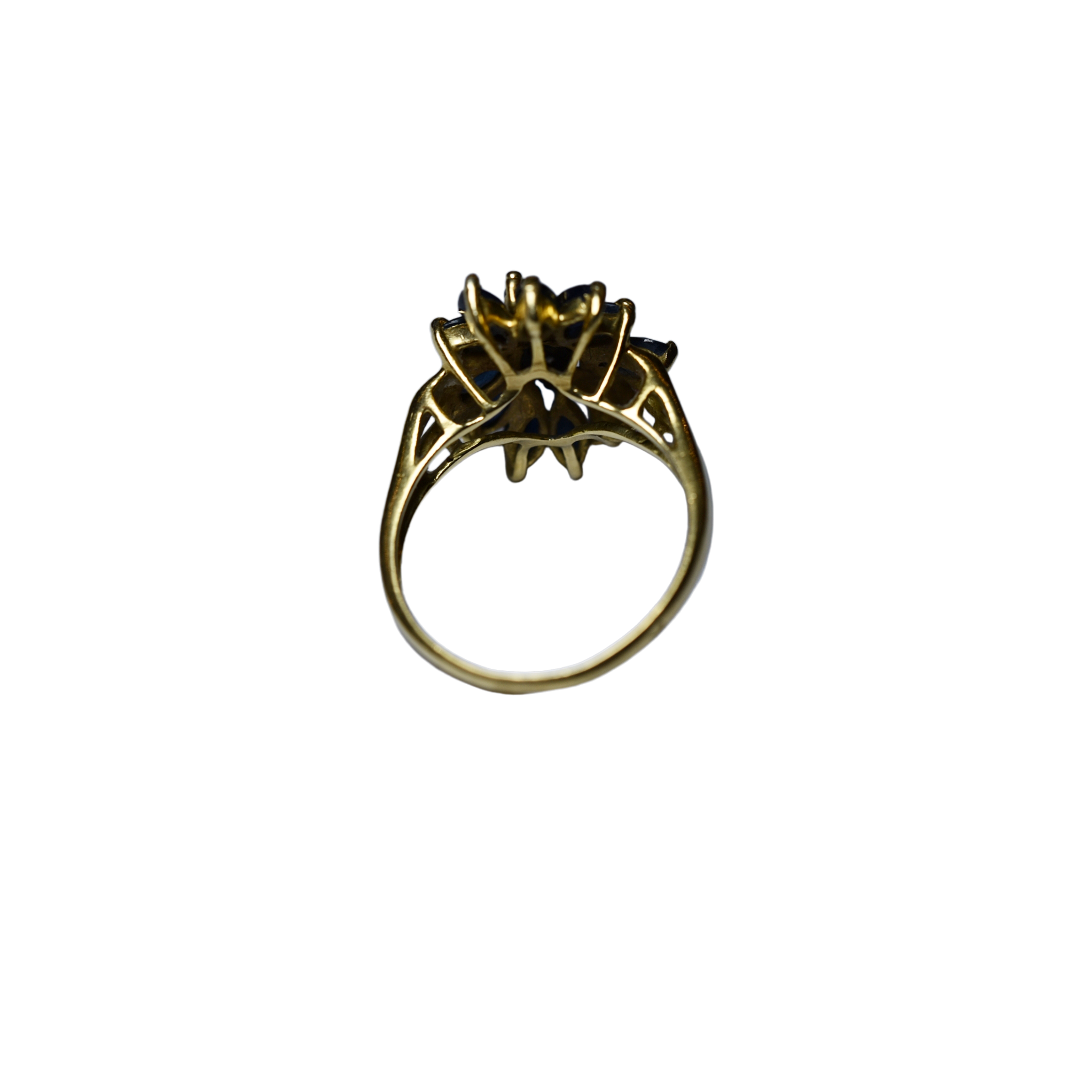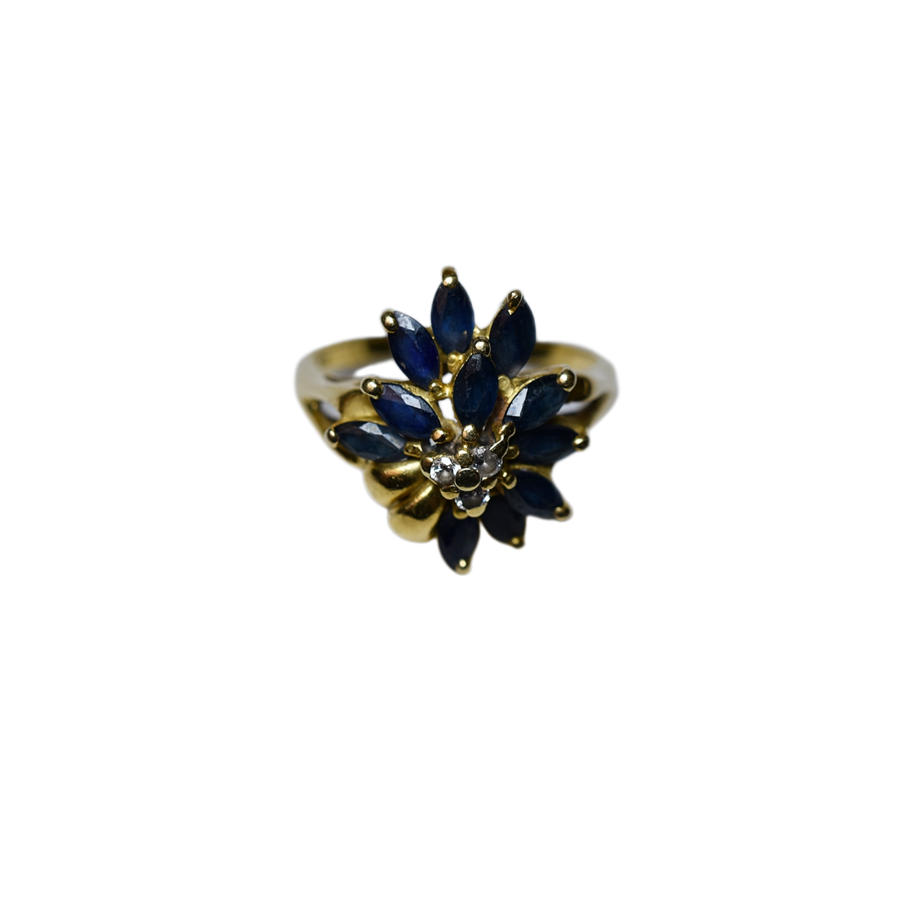 Rare bague ancienne or jaune de type florale avec 11 saphirs bleus et 3 petits diamants