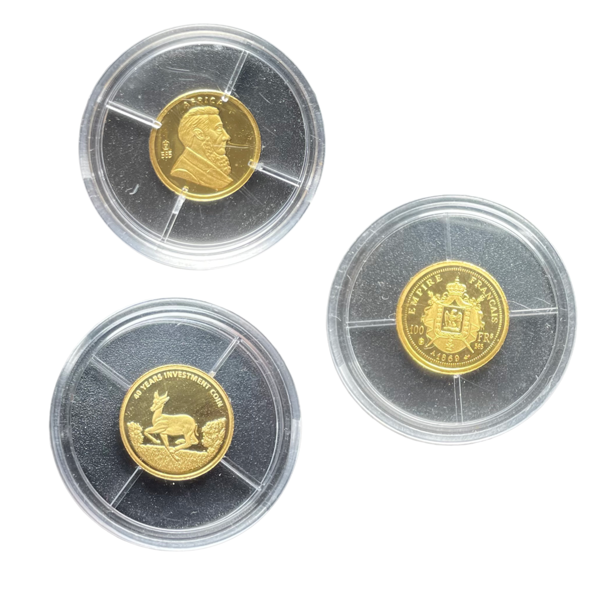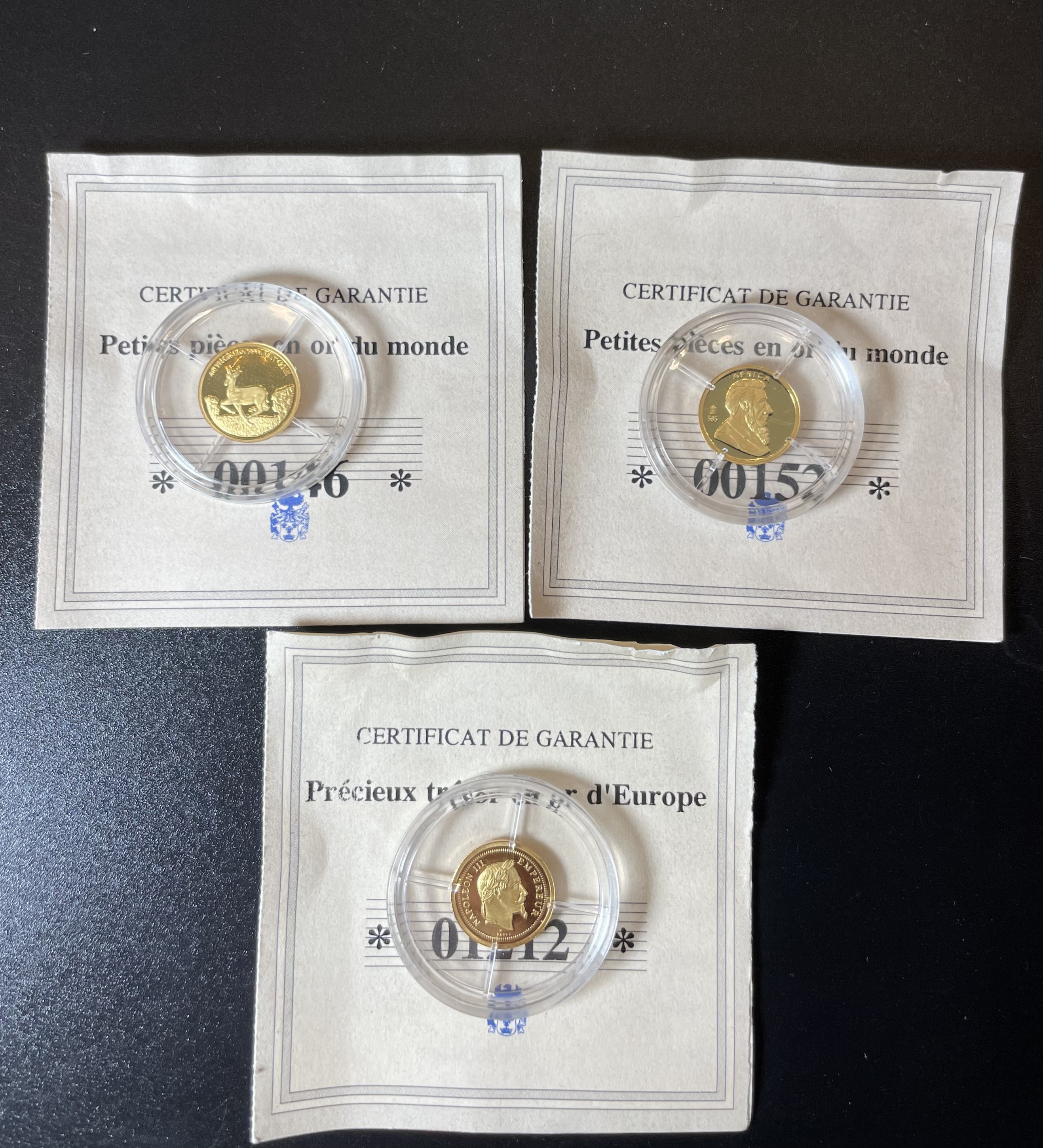 Lot de trois pièces en or 585 millièmes dans leurs boîtes de protection, avec certificat d’authenticité.