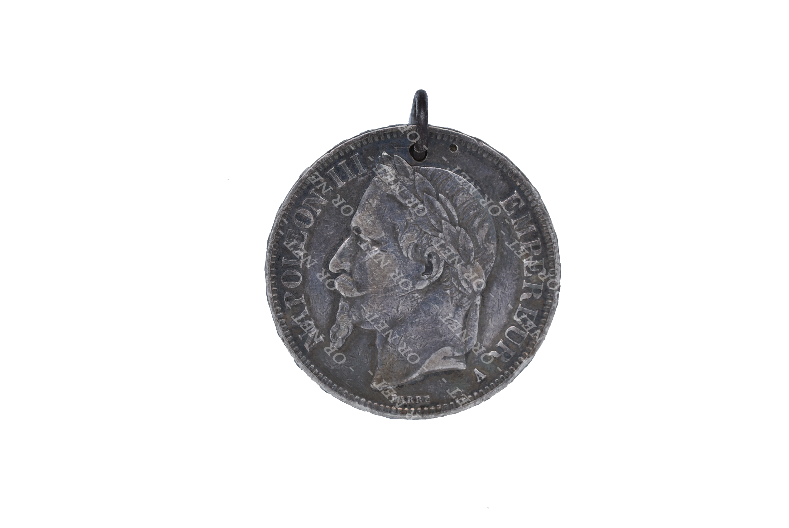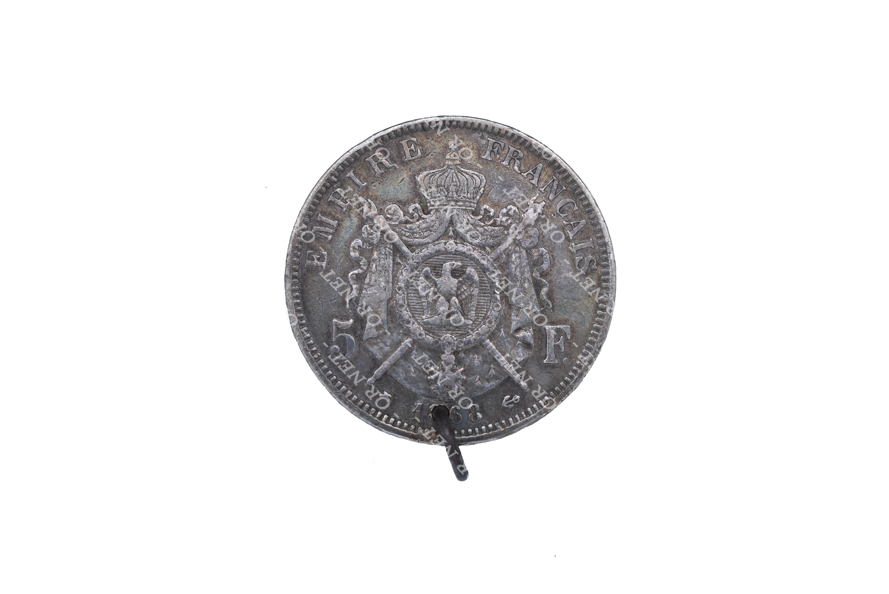 Pièce de 5FRS en argent Napoléon III 1868, percée pour pendentif.