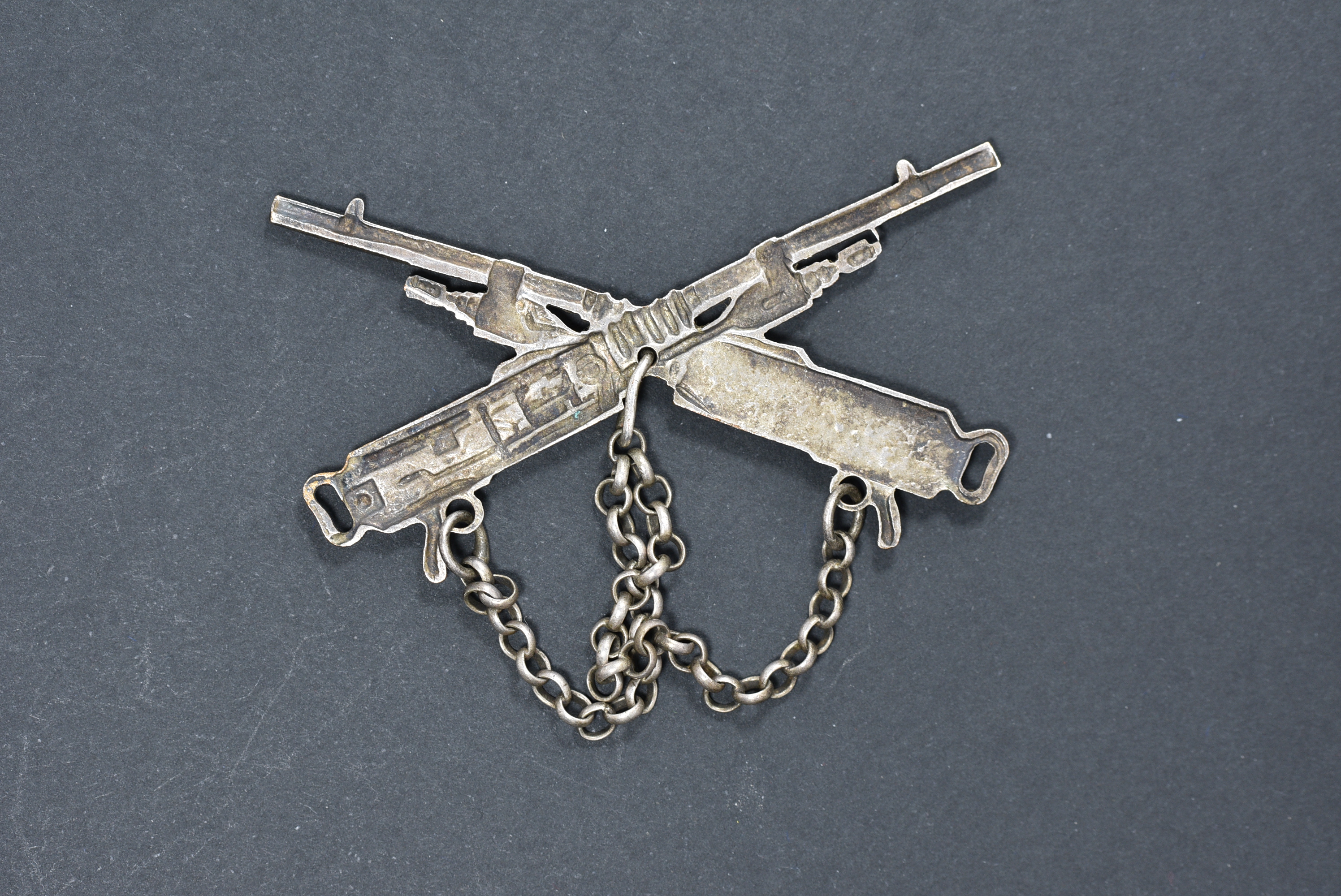 Une enseigne en argent, anciennes mitrailleuses croisées.